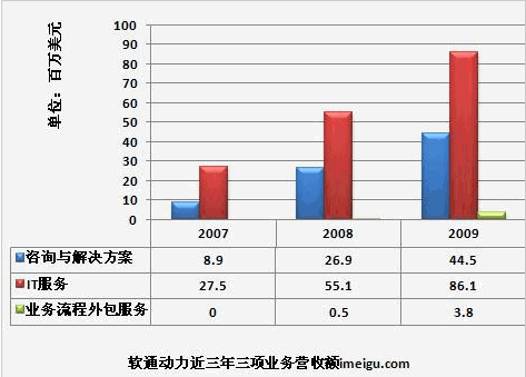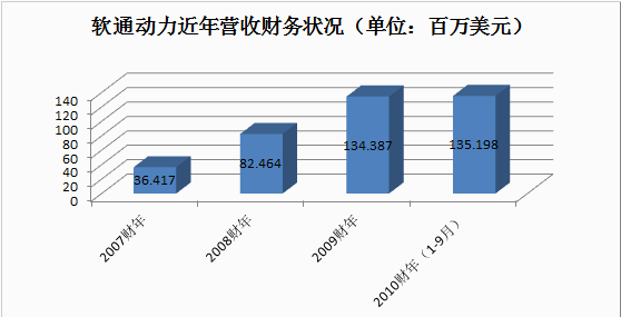 軟通動(dòng)力的收入從2007年的3642萬(wàn)美元大幅增長(zhǎng)到2009年的34億美元,年復(fù)合增長(zhǎng)率為92.15%。2010財(cái)年前九個(gè)月,軟通動(dòng)力的收入達(dá)到1.35億美元,超過(guò)了2009年全年的收入。