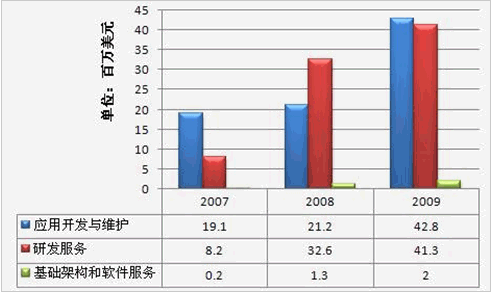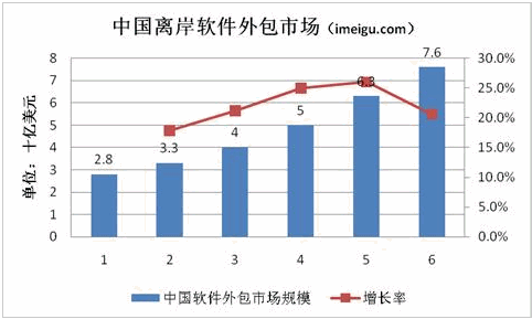 中國(guó)IT服務(wù)企業(yè)承擔(dān)的離岸IT服務(wù)項(xiàng)目主要是軟件外包。這些業(yè)務(wù)包括應(yīng)用程序開(kāi)發(fā)和管理、產(chǎn)品開(kāi)發(fā)、包裝解決方案服務(wù)、全球化和本地化服務(wù)等。這些客戶包括外國(guó)公司和外國(guó)公司在中國(guó)的分支機(jī)構(gòu)/子公司。中國(guó)的離岸軟件外包市場(chǎng)近年來(lái)也發(fā)展迅速。根據(jù)IDC 2010年7月的報(bào)告,中國(guó)離岸軟件市場(chǎng)規(guī)模將從2009年的28億美元增長(zhǎng)到2014年的76億美元,年復(fù)合增長(zhǎng)率為22.4%。
