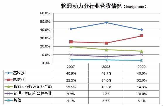 這些行業(yè)中,高科技行業(yè)占比最大,主要來(lái)自微軟、IBM等大型企業(yè)集團(tuán)的軟件分包項(xiàng)目;這些客戶也是軟通動(dòng)力最賺錢(qián)的客戶。2007年、2008年和2009年,來(lái)自高新技術(shù)產(chǎn)業(yè)的收入占軟通動(dòng)力總收入的40%以上。