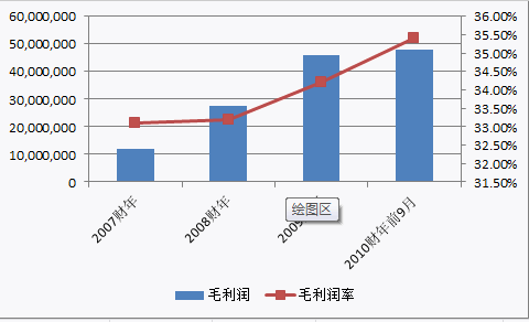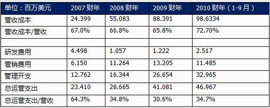 2007年以來(lái),軟通動(dòng)力的毛利潤(rùn)逐年增長(zhǎng),從2007年的1029萬(wàn)美元增加到2009年的4600萬(wàn)美元;2010年前三季度利潤(rùn)達(dá)到4786萬(wàn)美元;其毛利率也從2007年的28.2%提高到2009年的34.2%。