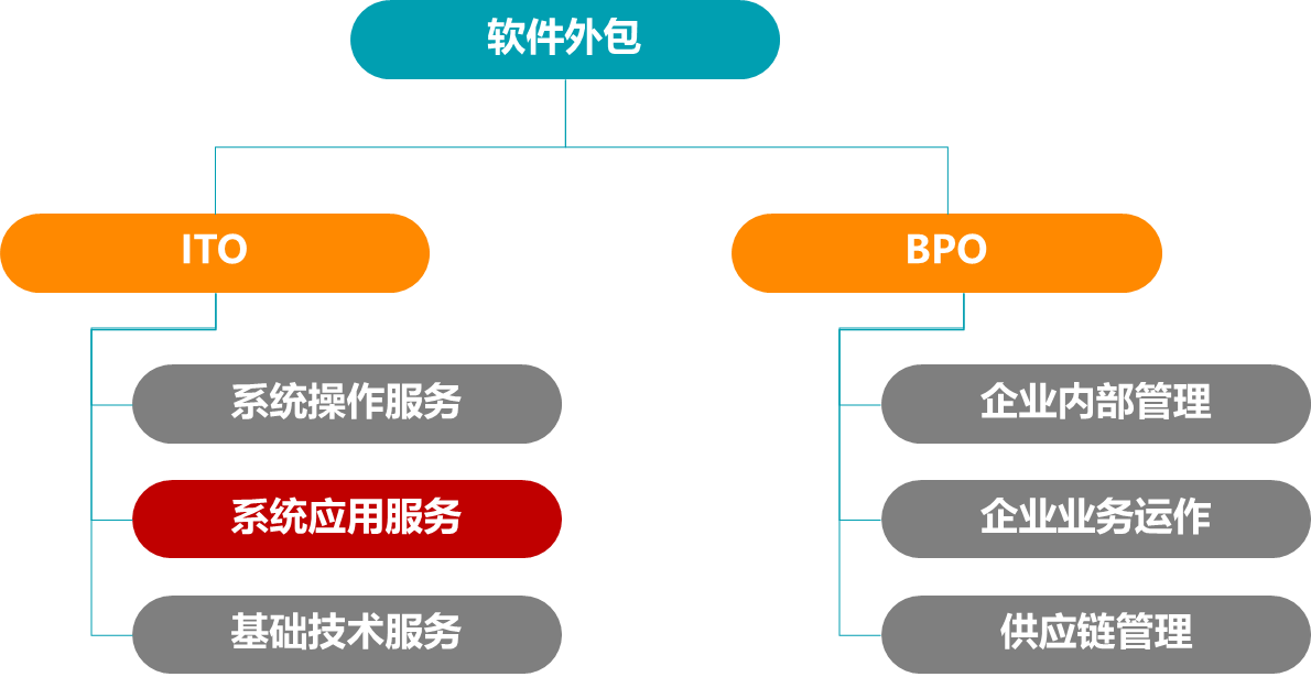 非核心IT業(yè)務(wù)外包部分被視為信息技術(shù)外包(ITO);而基于IT的業(yè)務(wù)流程外包部分稱為業(yè)務(wù)流程外包(BPO)。