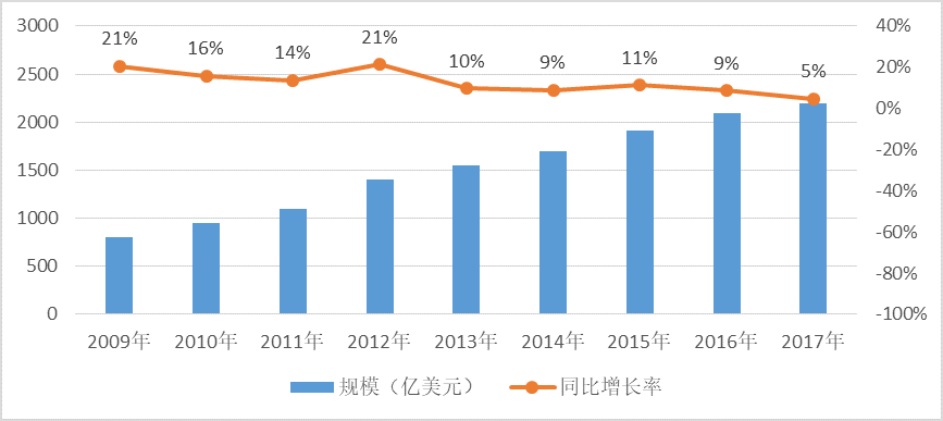 在全球信息化浪潮的強勁推動下,軟件產(chǎn)業(yè)已發(fā)展成為全球規(guī)模最大、最具活力的產(chǎn)業(yè)。 2009年,全球軟件外包規(guī)模為800億美元,到2017年,全球軟件外包規(guī)模達到2200億美元。全球軟件外包產(chǎn)業(yè)高速增長后,目前增速有所放緩,增速仍接近10%。