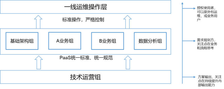從基于PaaS的運維技術架構的變化趨勢來看,如果把運維組織看成是一種技術架構,應該有一個“運維引擎型組織”來輸出運維解決方案到外面的世界。在基于PaaS的技術運營體系下,這個組織稱為技術運營組。