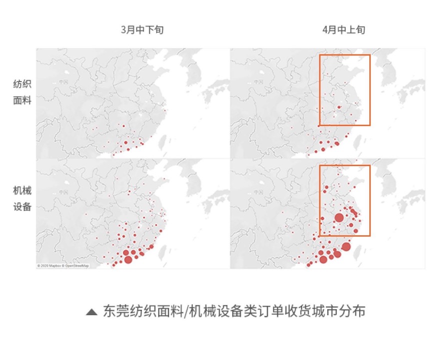 此外,東莞制造業(yè)發(fā)達(dá),城市交通需求最大的是機(jī)械設(shè)備。值得注意的是,數(shù)據(jù)顯示,東莞發(fā)往華東、華北的機(jī)械設(shè)備和服裝面料較3月份有明顯增長(zhǎng)。增加武漢數(shù)據(jù)恢復(fù),主要包括口罩生產(chǎn)設(shè)備和口罩原材料。