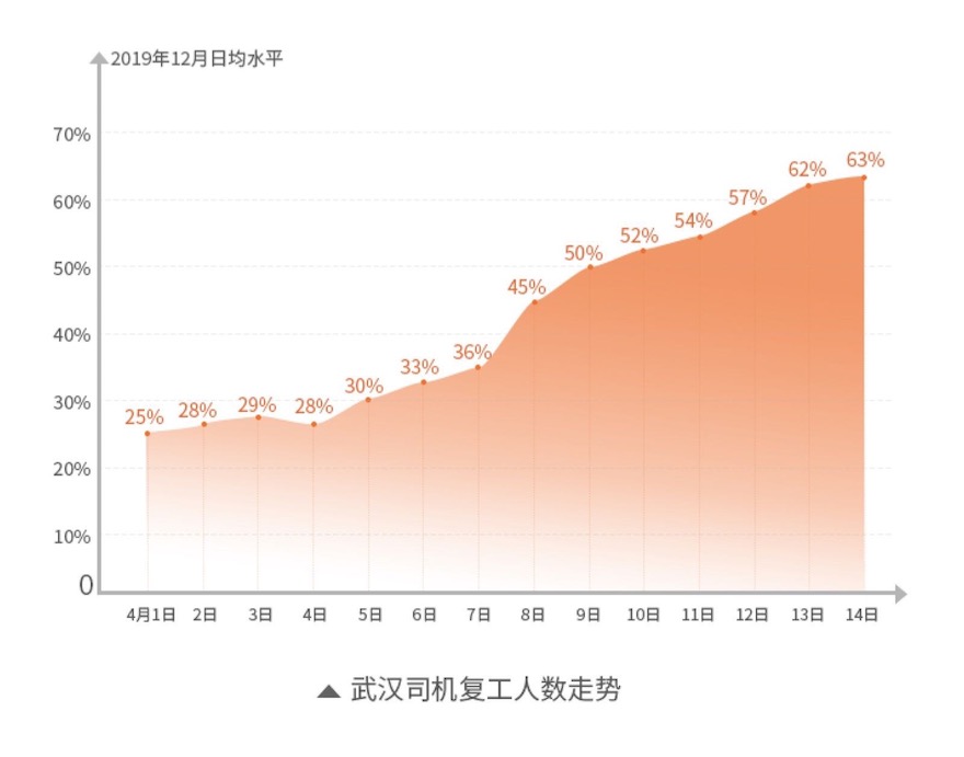 武漢火啦啦平臺(tái)司機(jī)的復(fù)工情況,也在一定程度上反映了當(dāng)?shù)氐膹?fù)蘇情況。 4月初武漢數(shù)據(jù)恢復(fù),只有1/4的司機(jī)返崗,增速相對(duì)緩慢,但在解封當(dāng)日(4月8日),司機(jī)返崗比例較上月提高了9個(gè)百分點(diǎn)。前一交易日,這也是近幾日來的最高單日漲幅。并在接下來的一周內(nèi)繼續(xù)顯著增加,到 4 月 14 日,司機(jī)復(fù)工人數(shù)已達(dá)到日均水平的 60%。