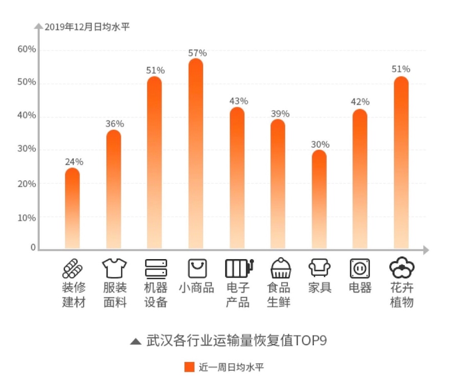 從貨運(yùn)需求回升來看,小商品、機(jī)械設(shè)備和花卉植物是目前需求回升最快的行業(yè),其中小商品運(yùn)輸量回升57%,成交武漢批發(fā)市場(chǎng)需求快速增長(zhǎng)。相信通過社會(huì)各界的共同努力,武漢離全面復(fù)蘇已經(jīng)不遠(yuǎn)了。